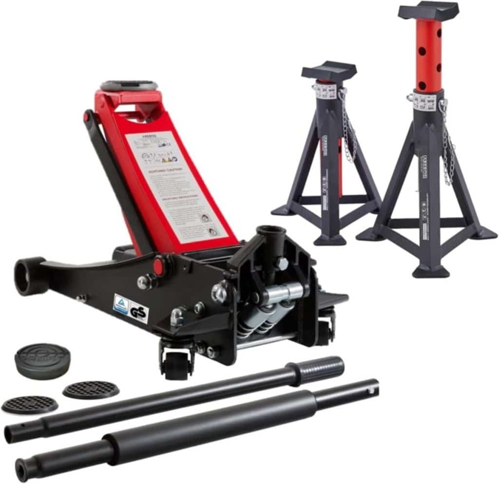 [Levage rapide grâce au système à double course] Le double système hydraulique intégré permet un levage particulièrement rapide du véhicule avec moins de mouvements de pompage, ce qui est idéal pour travailler efficacement sans effort. [Plat, solide et certifié TÜV] Avec une hauteur d'entrée de seulement 75 mm, le cric est parfait pour les véhicules surbaissés. Le cric et les chandelles sont certifiés TÜV Rheinland, pour une sécurité testée à chaque utilisation. [Support stable avec goupille de sécurité] Les chandelles disposent d'un réglage mécanique de la hauteur avec goupille de sécurité, pour un réglage précis et une fixation fiable. Idéal pour les travaux de longue durée sur le véhicule. [Antidérapant et n'abîme pas le véhicule] Le cric et les chandelles sont équipés de patins en caoutchouc robustes. Ceux-ci protègent les zones sensibles du véhicule et assurent un maintien sûr, sans glisser ni rayer. [Confort et ordre pendant le travail] La barre de levier rembourrée de mousse protège le véhicule pendant le pompage. Un compartiment de rangement intégré pour les vis et la combinaison bien pensée du kit rendent le travail particulièrement confortable.